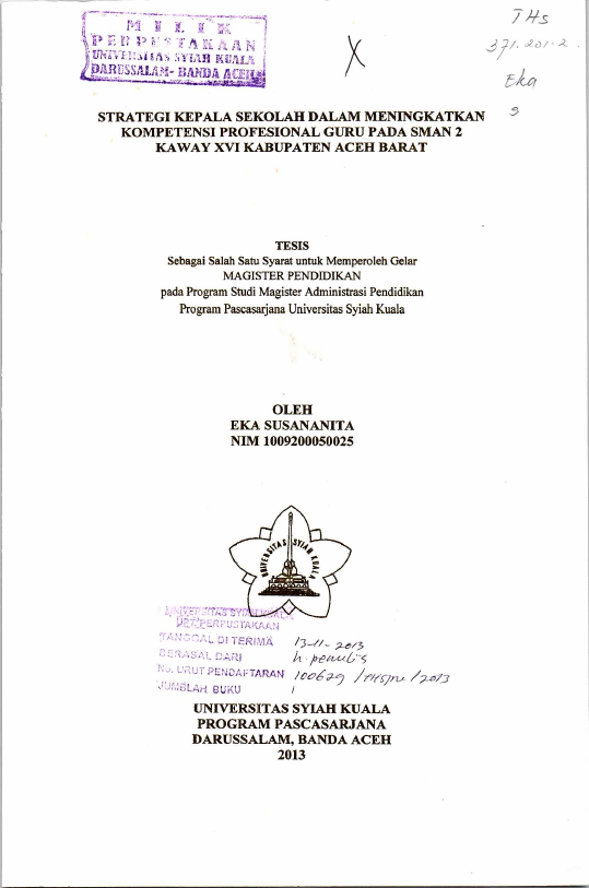 Eka Susananita, STRATEGI KEPALA SEKOLAH DALAM MENINGKATKAN KOMPETENSI PROFESIONAL GURU PADA SMAN 2 KAWAY XVI KABUPATEN ACEH BARAT. Banda Aceh prog. studi magister pendidikan,2013