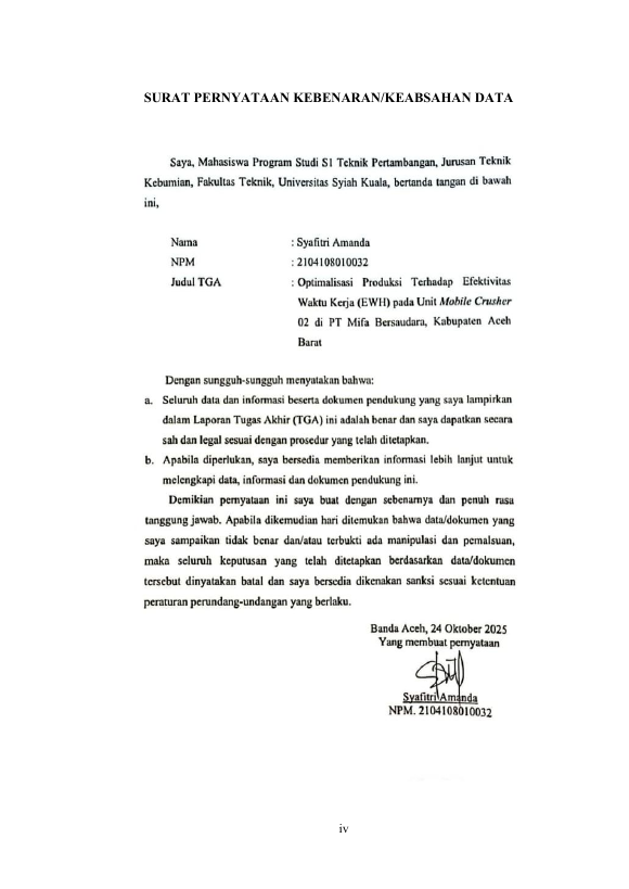 Baca Juga : ANALISIS KINERJA FIX CRUSHER (FC 01) PADA BULAN JUNI TAHUN 2024 GUNA MEMENUHI TARGET PRODUKSI DI PT MIFA BERSAUDARA, KECAMATAN MEUREBO, KABUPATEN ACEH BARAT (M. RAFID ZAIDAAN, 2025)