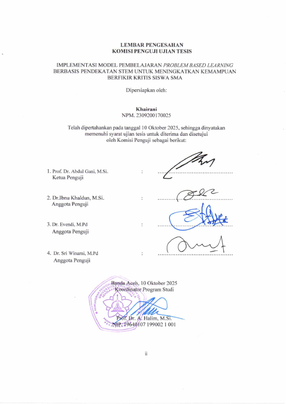 Khairani, IMPLEMENTASI MODEL PEMBELAJARAN PROBLEM BASED LEARNING BERBASIS PENDEKATAN STEM UNTUK MENINGKATKAN KEMAMPUAN BERPIKIR KRITIS SISWA SMA. Banda Aceh Program Pasca Sarjana - Pendidikan IPA,2025