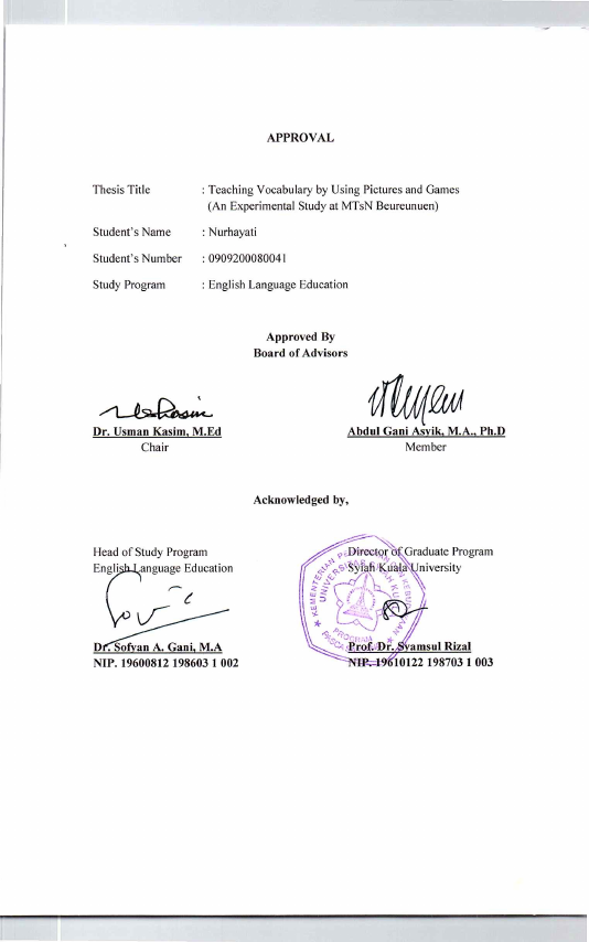 Nurhayati, TEACHING VOCABULARY BY USING PICTURES AND GAMES (AN EXPERIMENTAL TEACHING AT MTSN BEUREUNEUEN). Banda Aceh prog. studi magister pendidikan bahasa inggris,2013