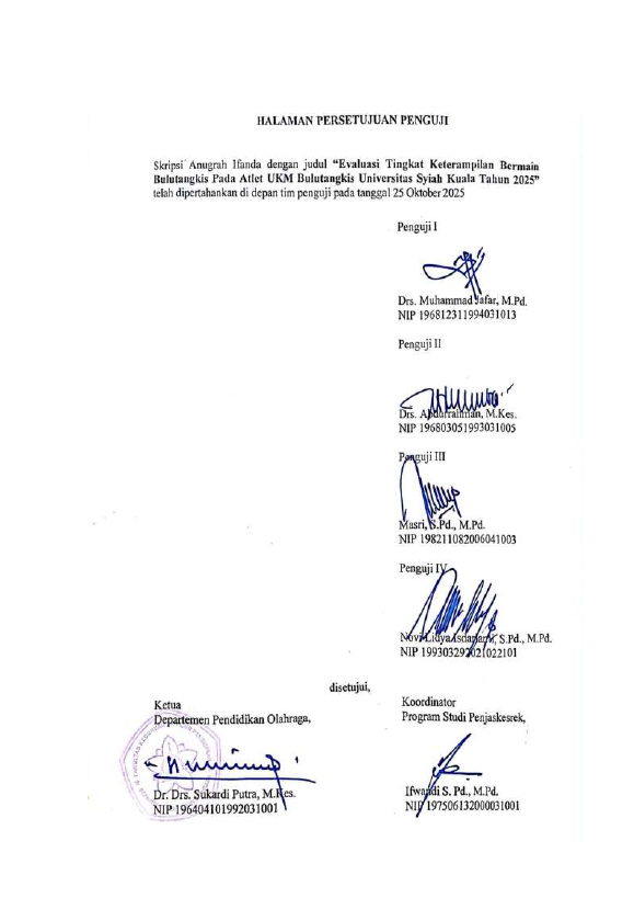 Anugrah Ifanda, EVALUASI TINGKAT KETERAMPILAN BERMAIN BULUTANGKIS PADA ATLET UKM BULUTANGKIS UNIVERSITAS SYIAH KUALA TAHUN 2025. Banda Aceh Fakultas FKIP UNSYIAH,2025