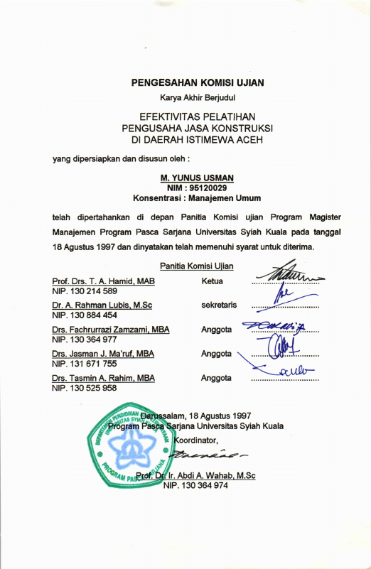 M YUNUS USMAN, EFEKTIVITAS PELATIHAN PENGUSAHA JASA KONSTRUKSI DI DAERAH ISTIMEWA ACEH. Banda Aceh Prog. Studi Magister Manajemen,1997