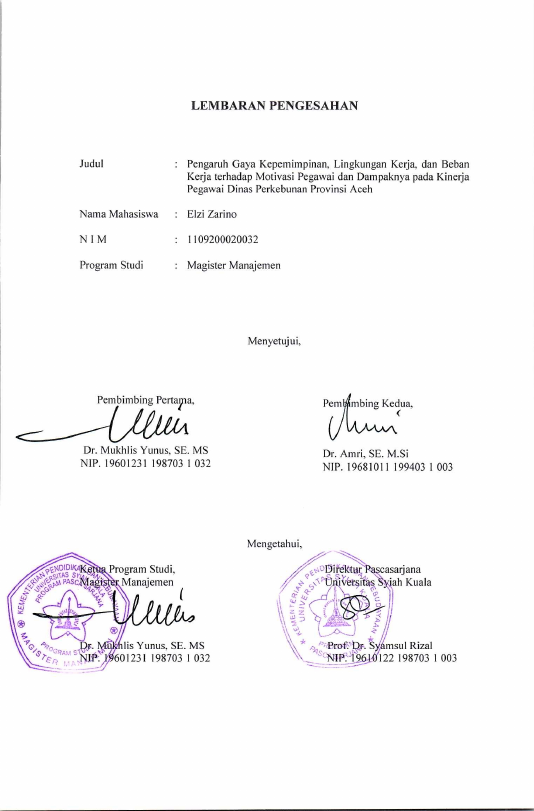 Elzi Zarino, PENGARUH GAYA KEPEMIMPINAN, LINGKUNGAN KERJA, DAN BEBAN KERJA TERHADAP MOTIVASI PEGAWAI DAN DAMPAKNYA PADA KINERJA PEGAWAI DINAS PERKEBUNAN PROVINSI ACEH. Banda Aceh Prog. Studi Magister Manajemen,2013