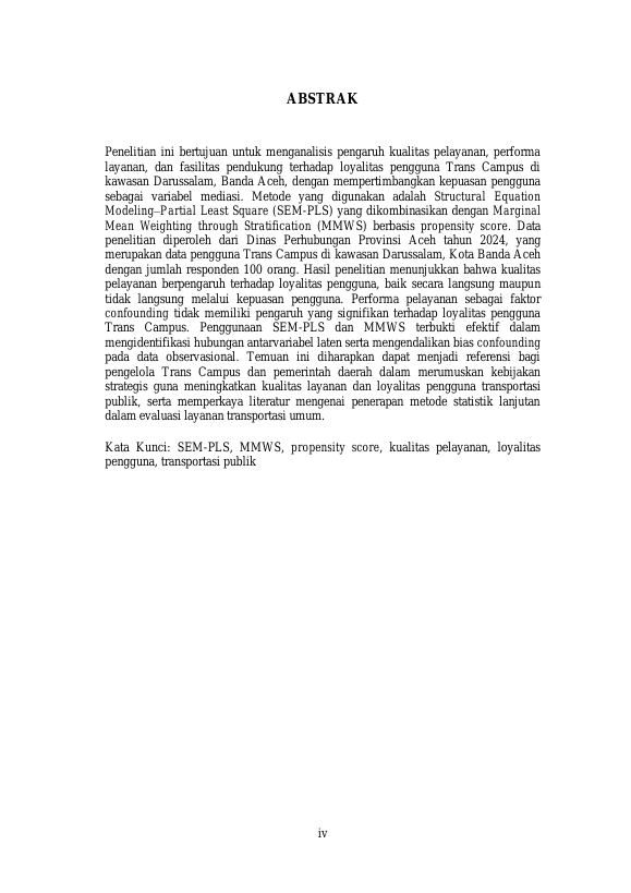 Kamil Aqila, PENERAPAN METODE PROPENSITY SCORE DENGAN PEMODELAN STRUCTURAL EQUATION MODEL- PARTIAL LEAST SQUARE (SEM-PLS) PADA LOYALITAS PENGGUNA TRANS CAMPUS DI KAWASAN DARUSSALAM, KOTA BANDA ACEH. Banda Aceh Fakultas MIPA Statistika,2025