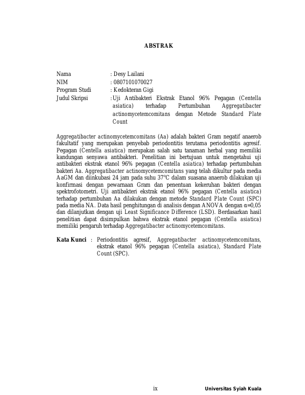 Baca Juga : UJI ANTIBAKTERI EKSTRAK ETANOL 96% PEGAGAN (CENTELLA ASIATICA) TERHADAP PERTUMBUHAN AGGREGATIBACTER ACTINOMYCETEMCOMITANS DENGAN METODE STANDARD PLATE COUNT (Desy lailani, 2023)