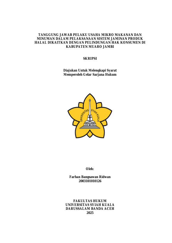 FARHAN BANGSAWAN RIDWAN, TANGGUNG JAWAB PELAKU USAHA MIKRO MAKANAN DAN MINUMAN DALAM PELAKSANAAN SISTEM JAMINAN PRODUK HALAL DIKAITKAN DENGAN PELINDUNGAN HAK KONSUMEN DI KABUPATEN MUARO JAMBI. Banda Aceh Fakultas Hukum Universitas Syiah Kuala,2026