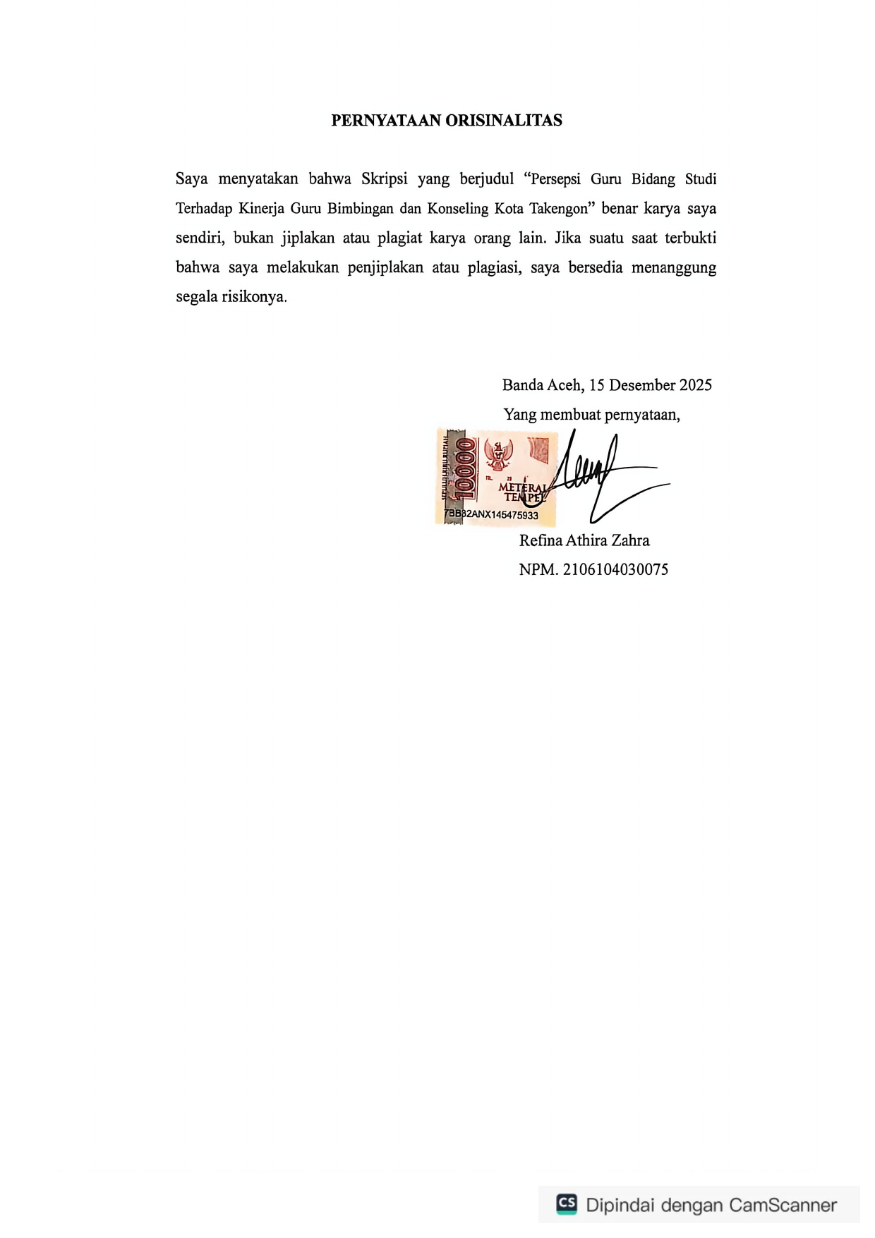 REFINA ATHIRA ZAHRA, PERSEPSI GURU BIDANG STUDI TERHADAP KINERJA GURU BIMBINGAN DAN KONSELING KOTA TAKENGON. Banda Aceh Fakultas KIP,2026