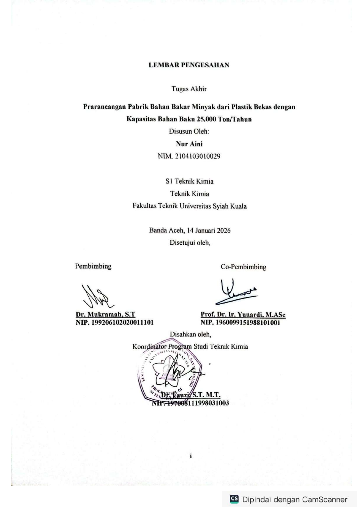 Baca Juga : PRARANCANGAN PABRIK BAHAN BAKAR MINYAK DARI PLASTIK BEKAS DENGAN KAPASITAS BAHAN BAKU 25.000 TON/TAHUN (NUR AINI, 2026)