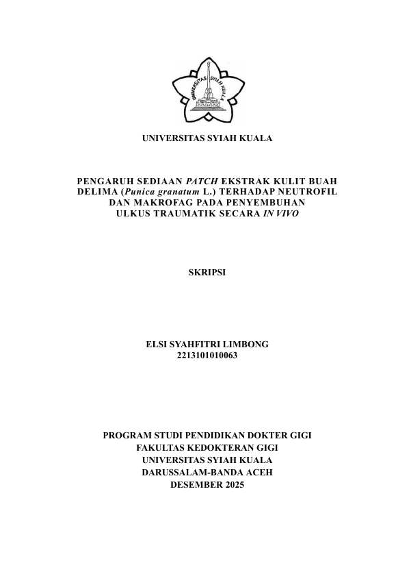 ELSI SYAHFITRI LIMBONG, PENGARUH SEDIAAN PATCH EKSTRAK KULIT BUAH DELIMA (PUNICA GRANATUM L.) TERHADAP NEUTROFIL DAN MAKROFAG PADA PENYEMBUHAN ULKUS TRAUMATIK SECARA IN VIVO. Banda Aceh Fakultas Kedokteran Gigi,2026