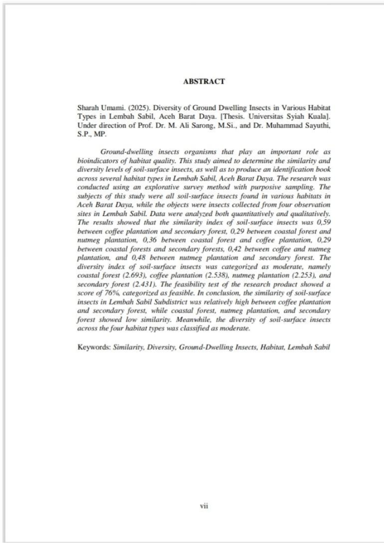 Sharah Umami, TINGKAT KERAGAMAN INSEKTA PERMUKAAN TANAH PADA BEBERAPA TIPE HABITAT DI KECAMATAN LEMBAH SABIL KABUPATEN ACEH BARAT DAYA. Banda Aceh Fakultas Magister Pendidikan Biologi,2026