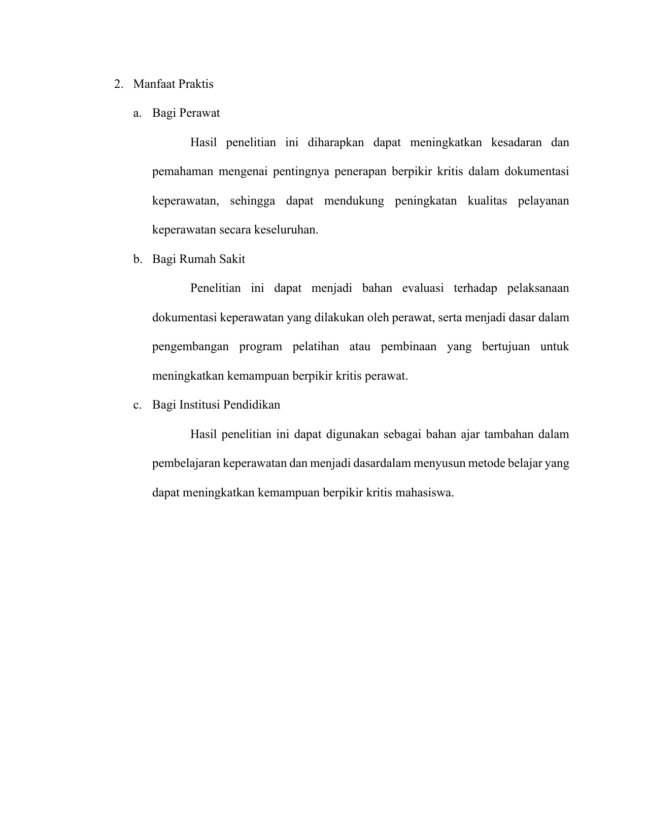 Baca Juga : HUBUNGAN BERPIKIR KRITIS PERAWAT DENGAN PENDOKUMENTASIAN PROSES KEPERAWATAN DI RUMAH SAKIT UMUM DAERAH MEURAXA KOTA BANDA ACEH (Dian Raiza Jannati, 2024)