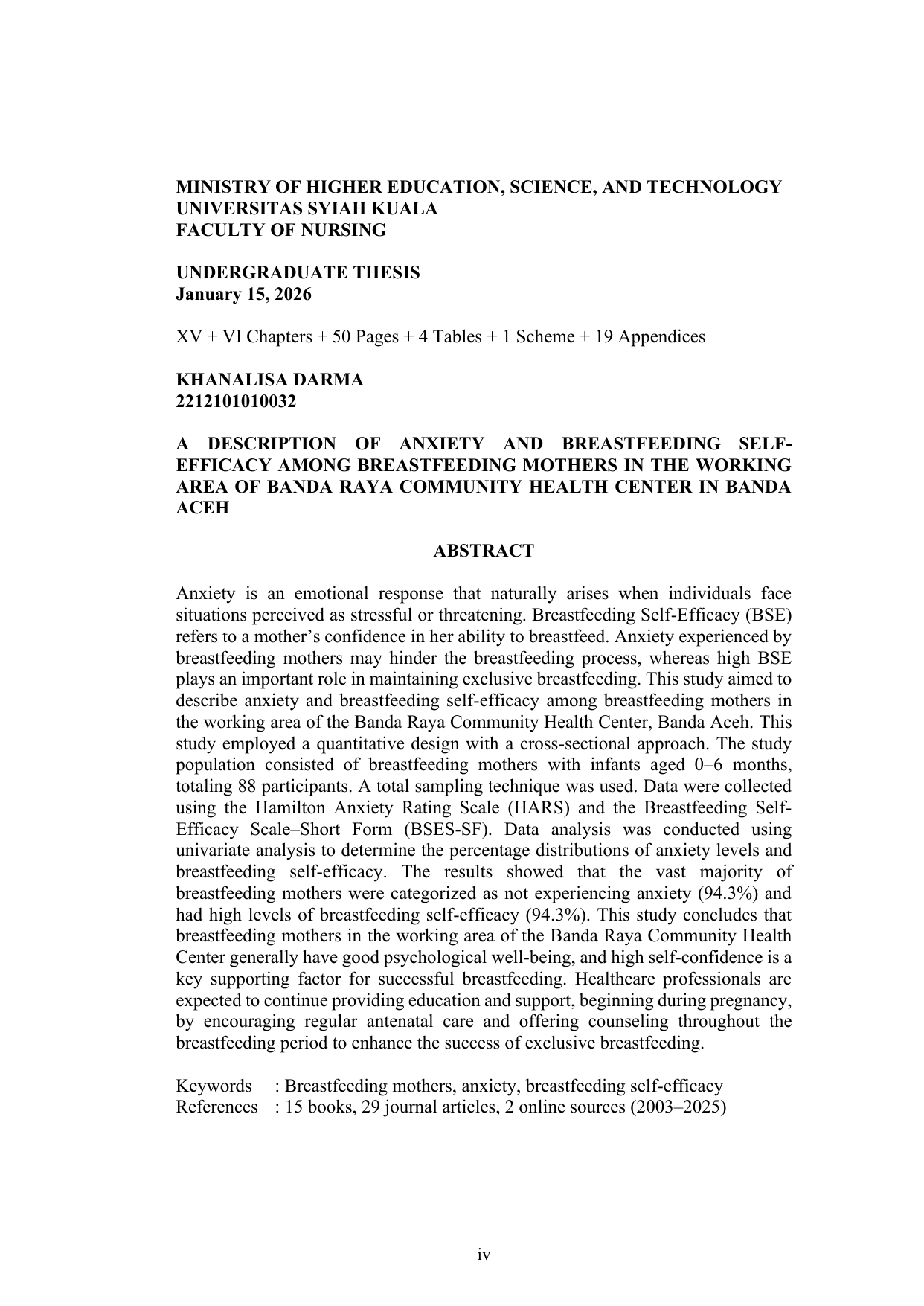 KHANALISA DARMA, GAMBARAN KECEMASAN DAN BREASTFEEDING SELF-EFFICACY PADA IBU MENYUSUI DI WILAYAH KERJA PUSKESMAS BANDA RAYA KOTA BANDA ACEH. Banda Aceh Fakultas Keperawatan,2026