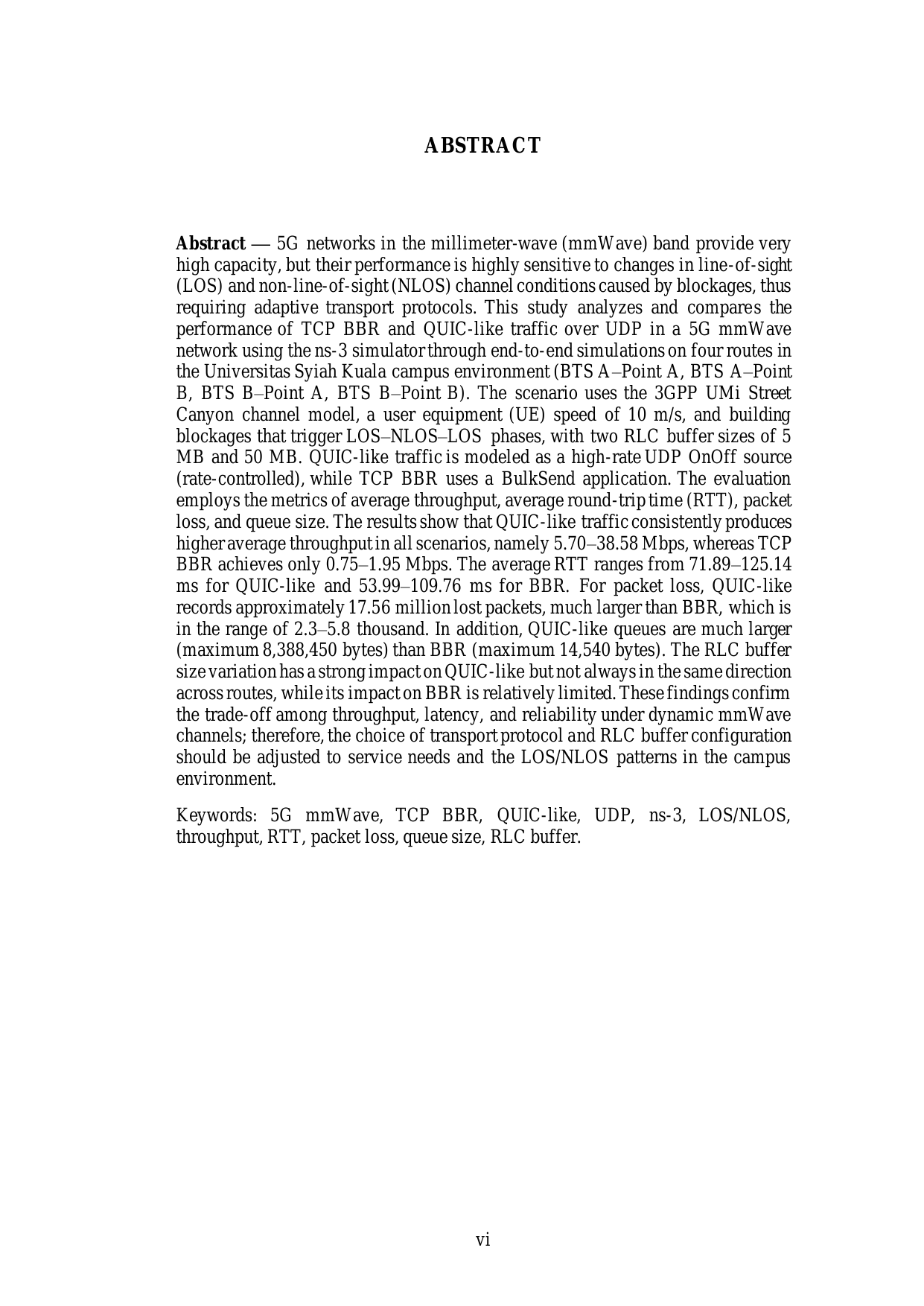 ZACKY AL-FAROUQ, ANALISIS PERFORMA TCP BBR DAN UDP QUIC PADA JARINGAN 5G MMWAVE DENGAN VARIASI JARAK DAN OBSTACLE GEDUNG TEKNIK USK MENGGUNAKAN NS-3. Banda Aceh Fakultas Teknik,2026
