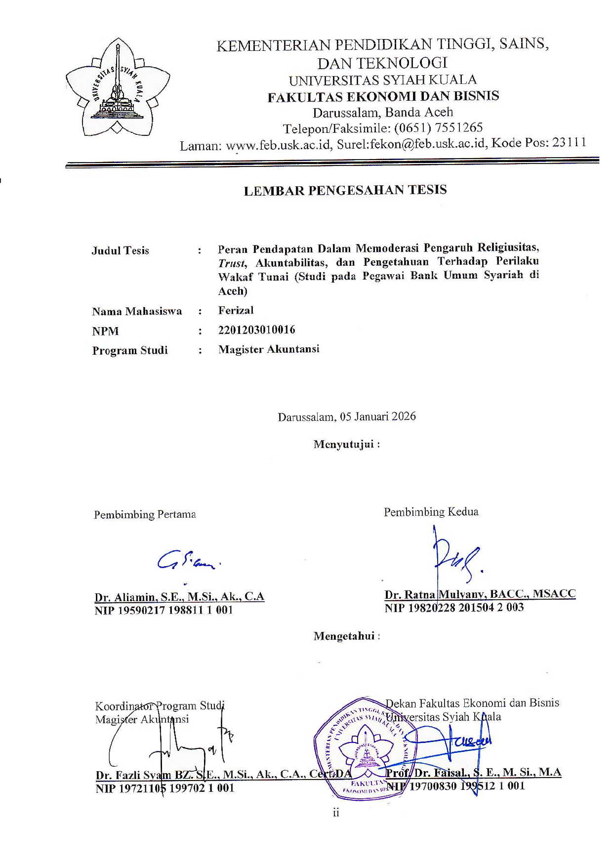 Ferizal, PERAN PENDAPATAN DALAM MEMODERASI PENGARUH RELIGIUSITAS, TRUST, AKUNTABILITAS, DAN PENGETAHUAN TERHADAP PERILAKU WAKAF TUNAI (STUDI PADA PEGAWAI BANK UMUM SYARIAH DI ACEH). Banda Aceh Fakultas Ekonomi dan Bisnis,2026