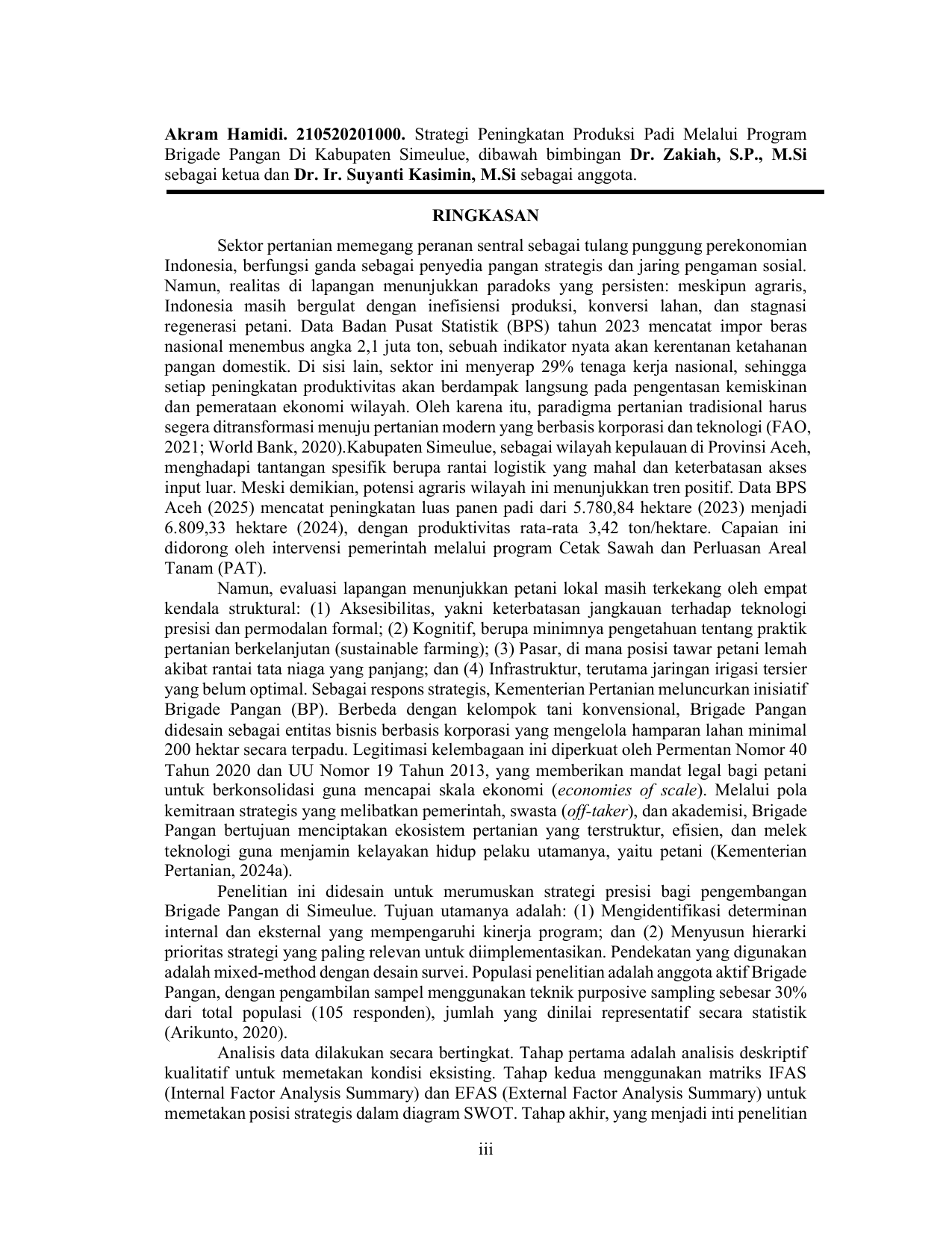 Akram Hamidi, STRATEGI PENINGKATAN PRODUKSI PADI MELALUI PROGRAM BRIGADE PANGAN DI KABUPATEN SIMEULUE. Banda Aceh Fakultas Pertanian,2026