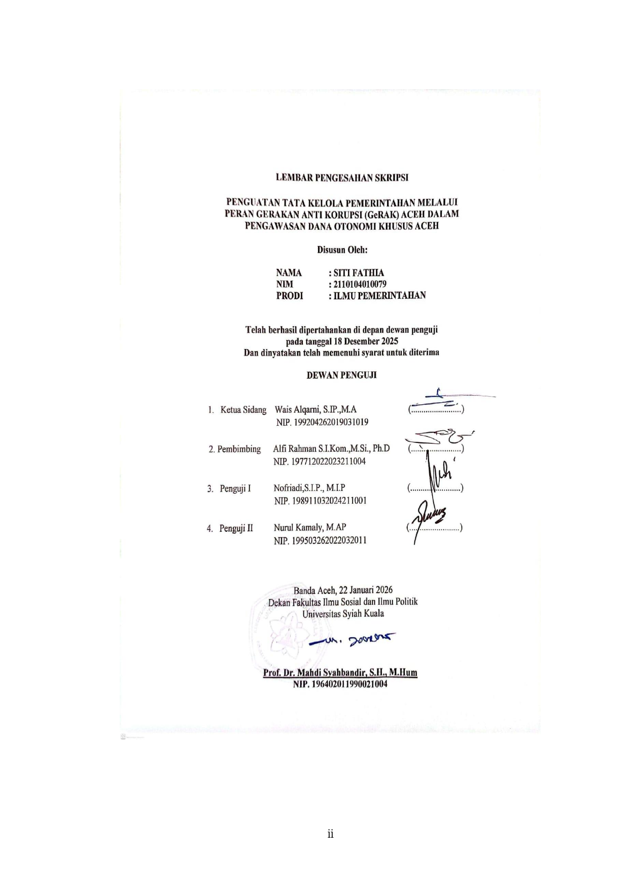 SITI FATHIA, PENGUATAN TATA KELOLA PEMERINTAHAN MELALUI PERAN GERAKAN ANTI KORUPSI (GERAK) ACEH DALAM PENGAWASAN DANA OTONOMI KHUSUS ACEH. Banda Aceh Fakultas Ilmu Sosial dan Ilmu Politik-Universitas Syiah Kuala,2026