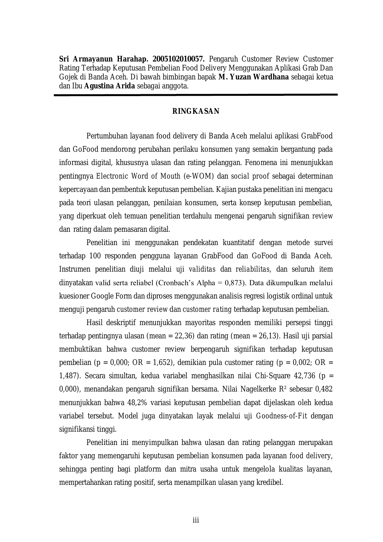 Baca Juga : PENGARUH CUSTOMER REVIEW CUSTOMER RATING TERHADAP KEPUTUSAN PEMBELIAN FOOD DELIVERY MENGGUNAKAN APLIKASI GRAB DAN GOJEK DI BANDA ACEH (SRI ARMAYANUN HRP, 2026)