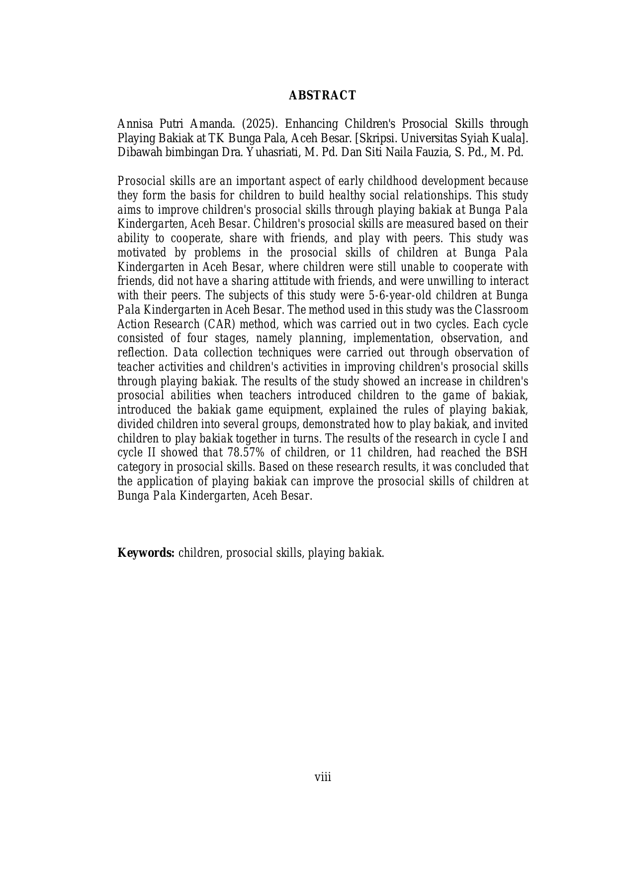 ANNISA PUTRI AMANDA, MENINGKATKAN KEMAMPUAN PROSOSIAL ANAK MELALUI BERMAIN BAKIAK DI TK BUNGA PALA ACEH BESAR. Banda Aceh Fakultas KIP,2026