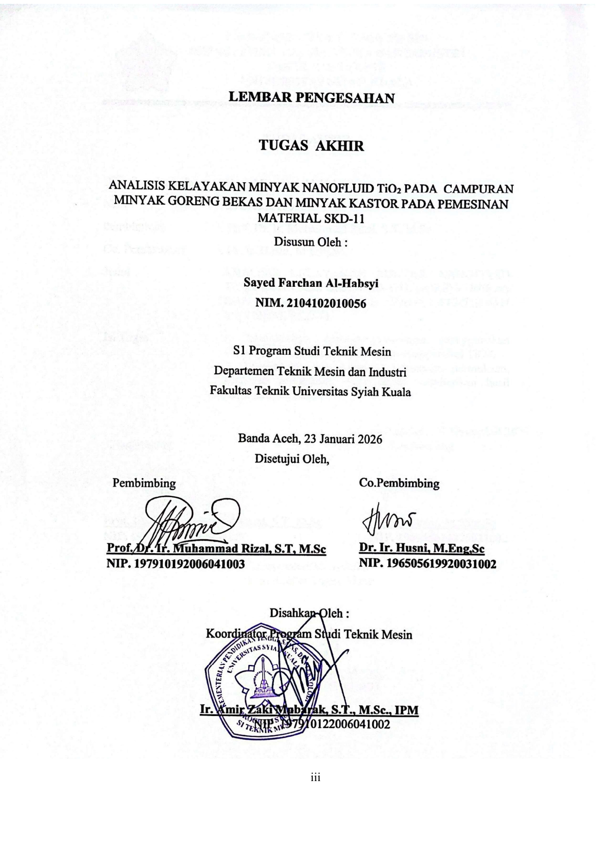 SAYED FARCHAN AL-HABSYI, ANALISIS KELAYAKAN MINYAK NANOFLUID TIO2 PADA CAMPURAN MINYAK GORENG BEKAS DAN MINYAK KASTOR PADA PEMESINAN MATERIAL SKD-11. Banda Aceh Fakultas Teknik - Teknik Mesin,2026