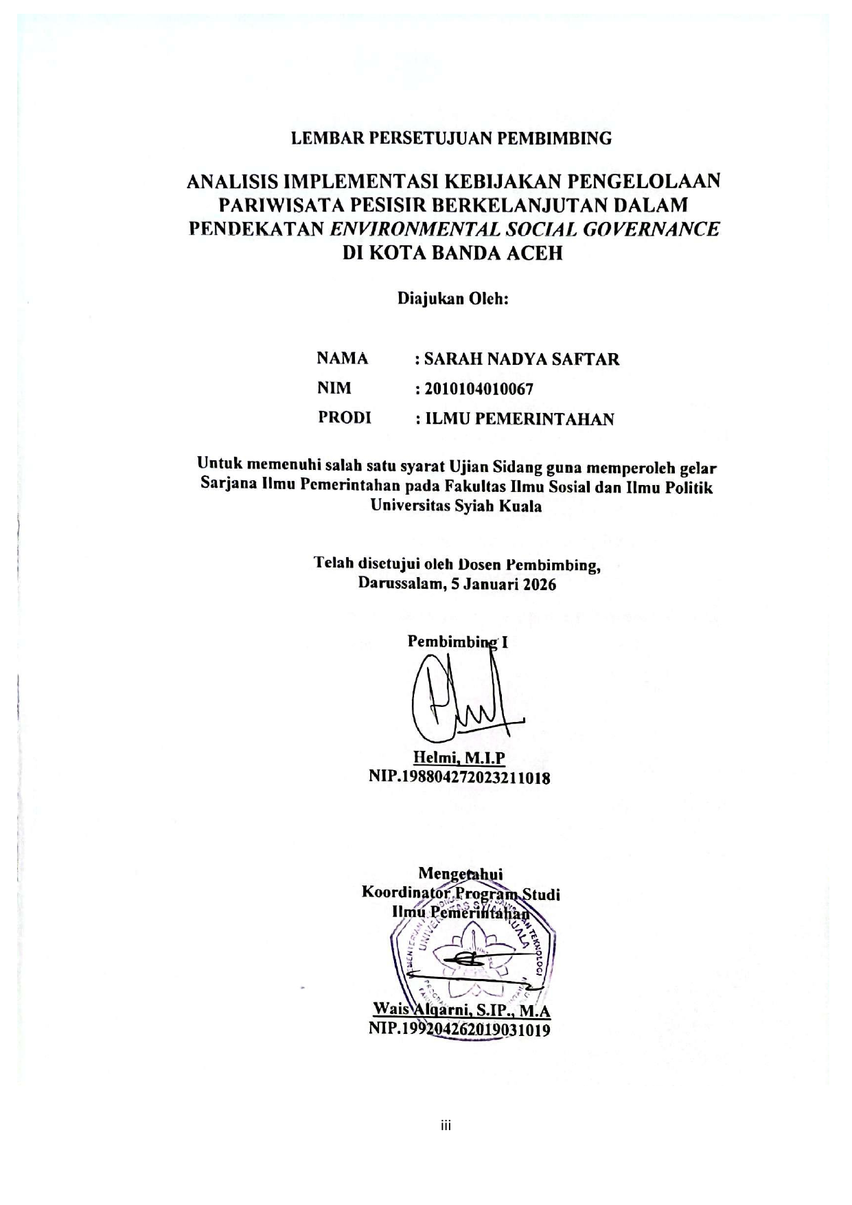 SARAH NADYA SAFTAR, ANALISIS IMPLEMENTASI KEBIJAKAN PENGELOLAAN PARIWISATA PESISIR BERKELANJUTAN DALAM PENDEKATAN ENVIRONMENTAL SOCIAL GOVERNANCE RNDI KOTA BANDA ACEH. Banda Aceh Fakultas Ilmu Sosial dan Ilmu Politik-Universitas Syiah Kuala,2026