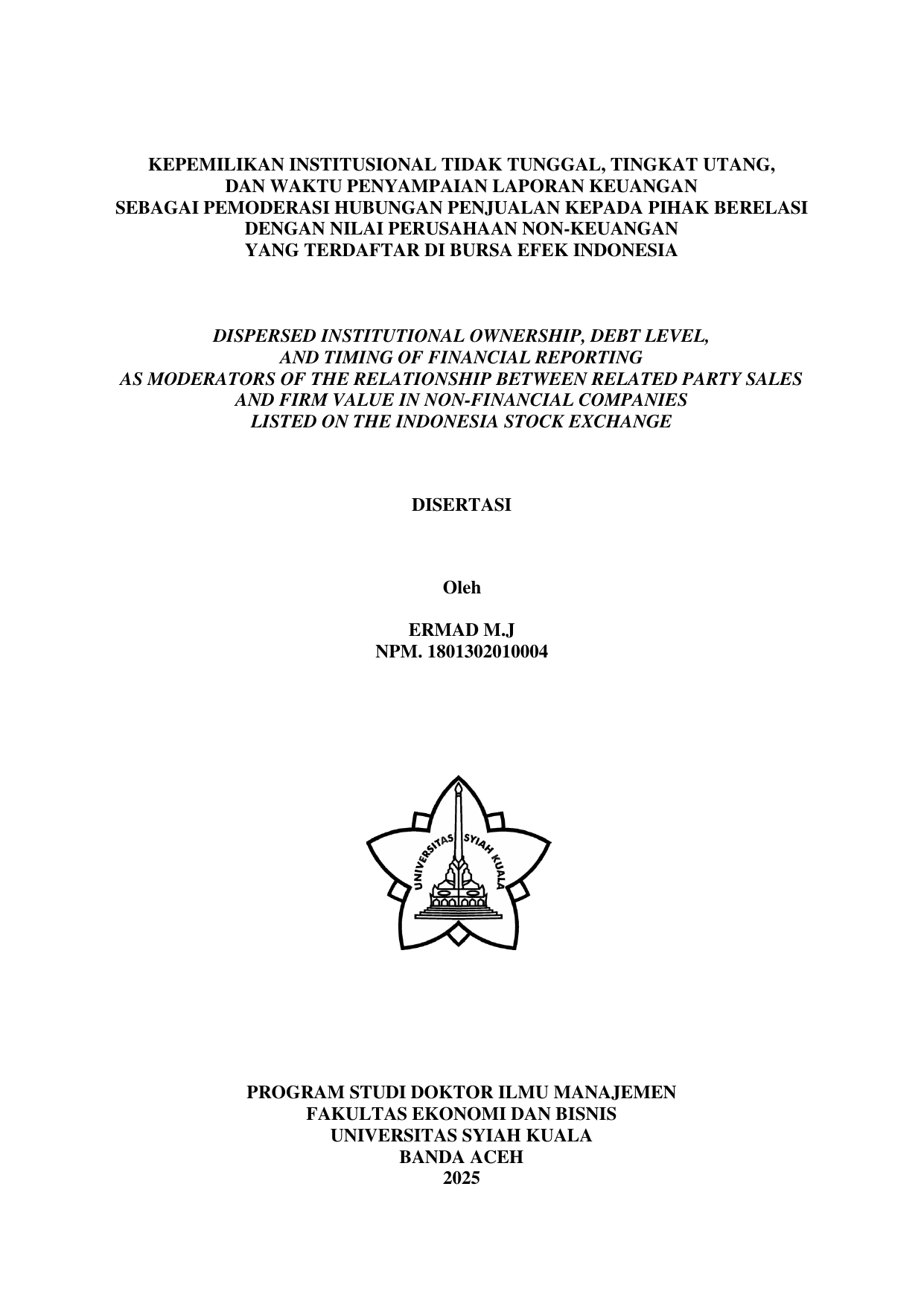 KEPEMILIKAN INSTITUSIONAL TIDAK TUNGGAL, TINGKAT UTANG, DAN WAKTU PENYAMPAIAN LAPORAN KEUANGAN SEBAGAI PEMODERASI HUBUNGAN PENJUALAN KEPADA PIHAK BERELASI DENGAN NILAI PERUSAHAAN NON-KEUANGAN YANG TERDAFTAR DI BURSA EFEK INDONESIA. Banda Aceh Fakultas Ekonomi dan Bisnis Doktor Ilmu Manajemen,2026