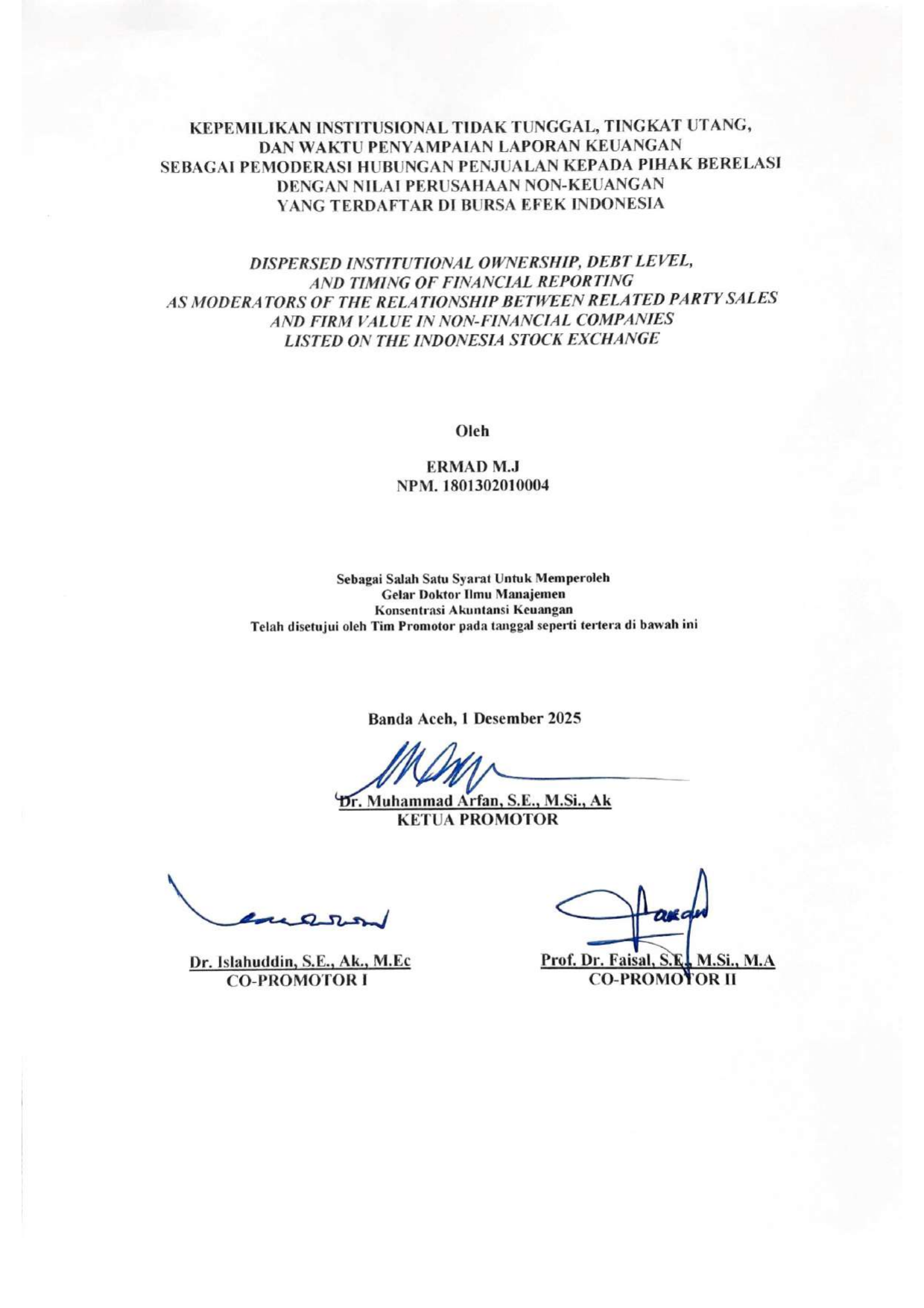 KEPEMILIKAN INSTITUSIONAL TIDAK TUNGGAL, TINGKAT UTANG, DAN WAKTU PENYAMPAIAN LAPORAN KEUANGAN SEBAGAI PEMODERASI HUBUNGAN PENJUALAN KEPADA PIHAK BERELASI DENGAN NILAI PERUSAHAAN NON-KEUANGAN YANG TERDAFTAR DI BURSA EFEK INDONESIA. Banda Aceh Fakultas Ekonomi dan Bisnis Doktor Ilmu Manajemen,2026