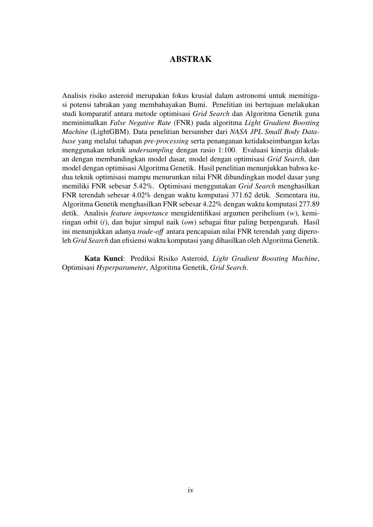 T. M. Chalid Al Kausar, STUDI KOMPARATIF ALGORITMA GENETIK DAN GRID SEARCH PADA OPTIMISASI HYPERPARAMETER DALAM PREDIKSI RISIKO ASTEROID. Banda Aceh Fakultas mipa,2026