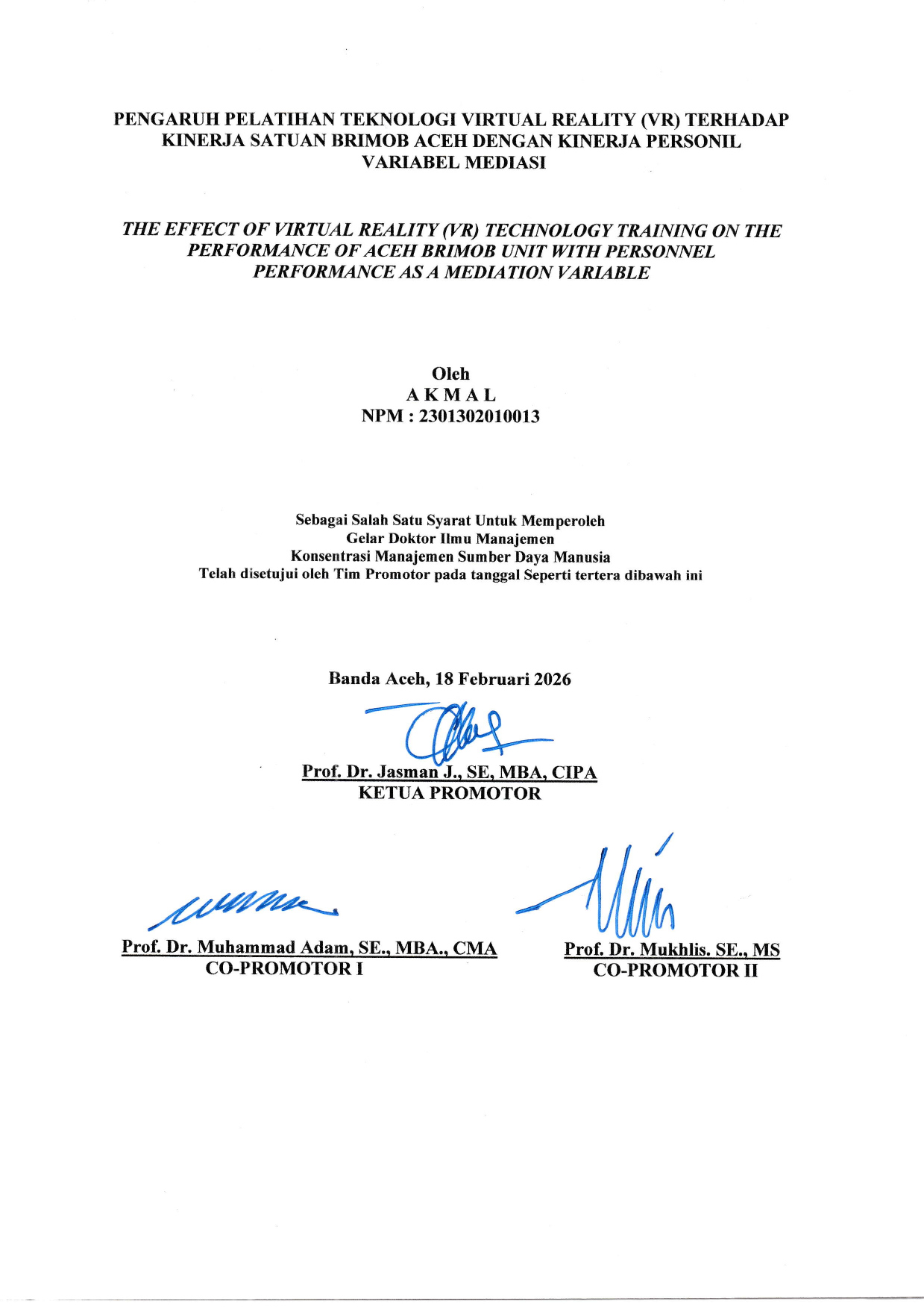 Akmal, PENGARUH PELATIHAN TEKNOLOGI VIRTUAL REALITY (VR) TERHADAP KINERJA SATUAN BRIMOB ACEH DENGAN KINERJA PERSONIL SEBAGAI VARIABEL MEDIASI. Banda Aceh Fakultas Ekonomi dan Bisnis,2026