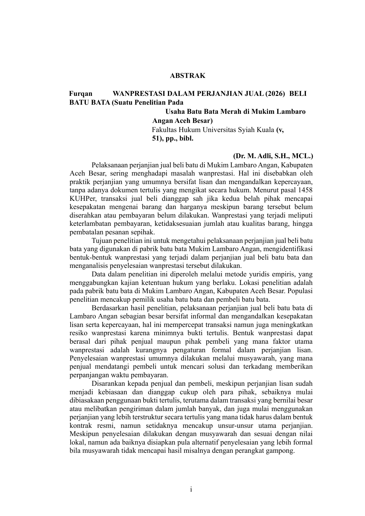 Furqan, WANPRESTASI DALAM PERJANJIAN JUAL BELI BATU BATA (SUATU PENELITIAN PADA USAHA BATU BATA MERAH DI MUKIM LAMBARO ANGAN ACEH BESAR). Banda Aceh Fakultas Hukum,2026