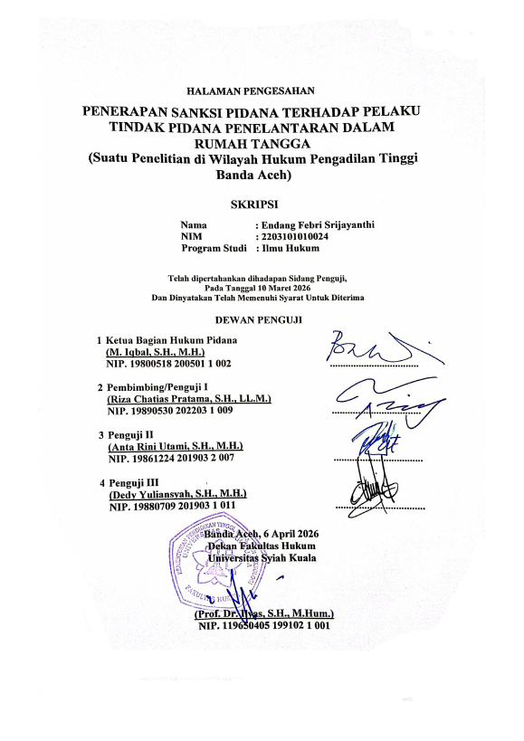 ENDANG FEBRI SRIJAYANTHI, PENERAPAN SANKSI PIDANA TERHADAP PELAKU TINDAK PIDANA PENELANTARAN DALAM RUMAH TANGGA (SUATU PENELITIAN DI WILAYAH HUKUM PENGADILAN TINGGI BANDA ACEH). Banda Aceh Program Studi Doktor Ilmu Hukum Universitas Syiah Kuala,2026