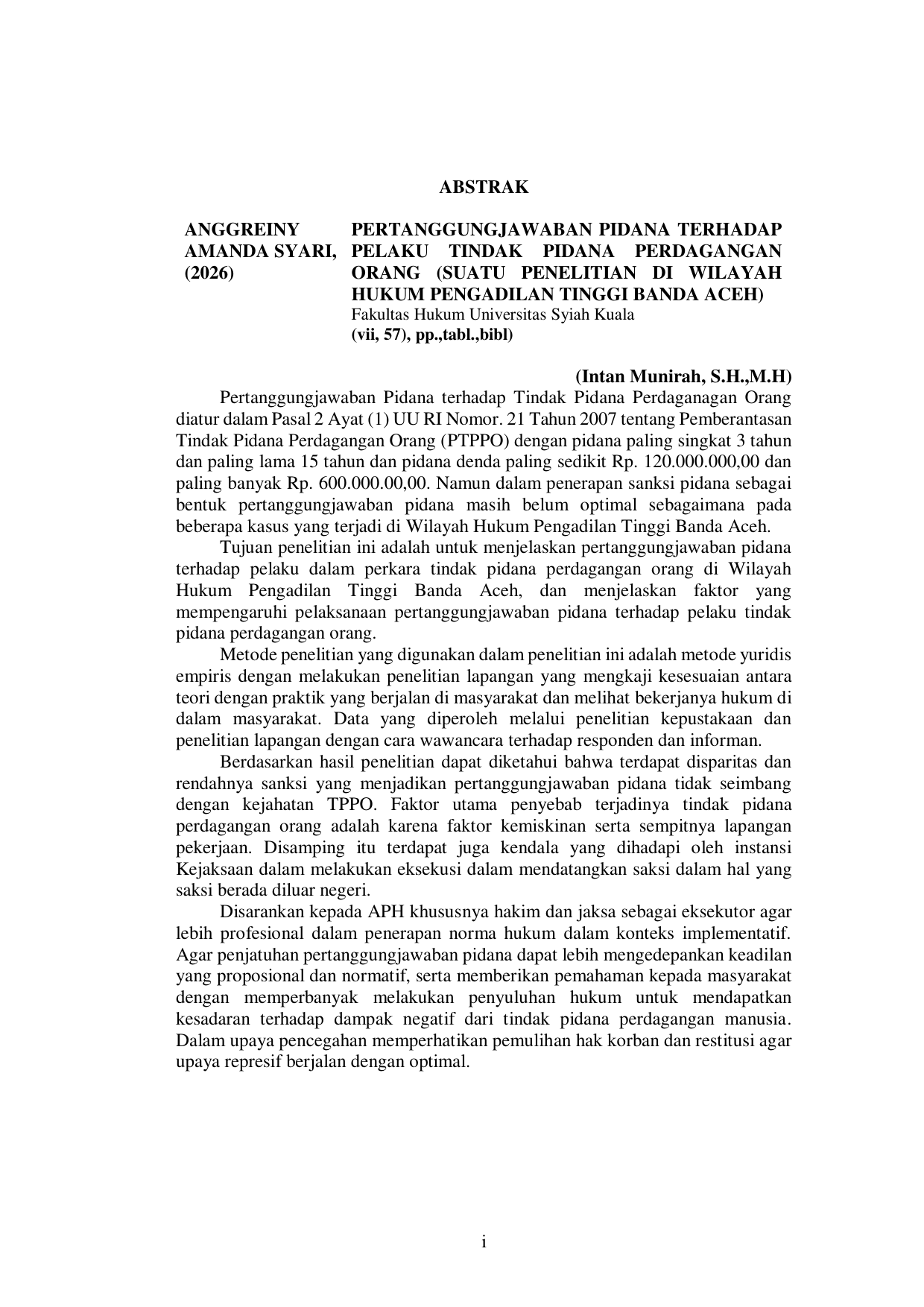 Anggreiny Amanda Syari, PERTANGGUNGJAWABAN PIDANA TERHADAP PELAKU TINDAK PIDANA PERDAGANGAN ORANG (SUATU PENELITIAN DI WILAYAH HUKUM PENGADILAN TINGGI BANDA ACEH). Banda Aceh Fakultas Hukum,2026