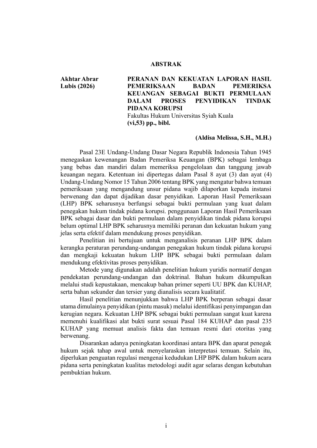AKHTAR ABRAR LUBIS, PERANAN DAN KEKUATAN LAPORAN HASIL PEMERIKSAAN BADAN PEMERIKSA KEUANGAN SEBAGAI BUKTI PERMULAAN DALAM PROSES PENYIDIKAN TINDAK PIDANA KORUPSI. Banda Aceh Fakultas Hukum,2026
