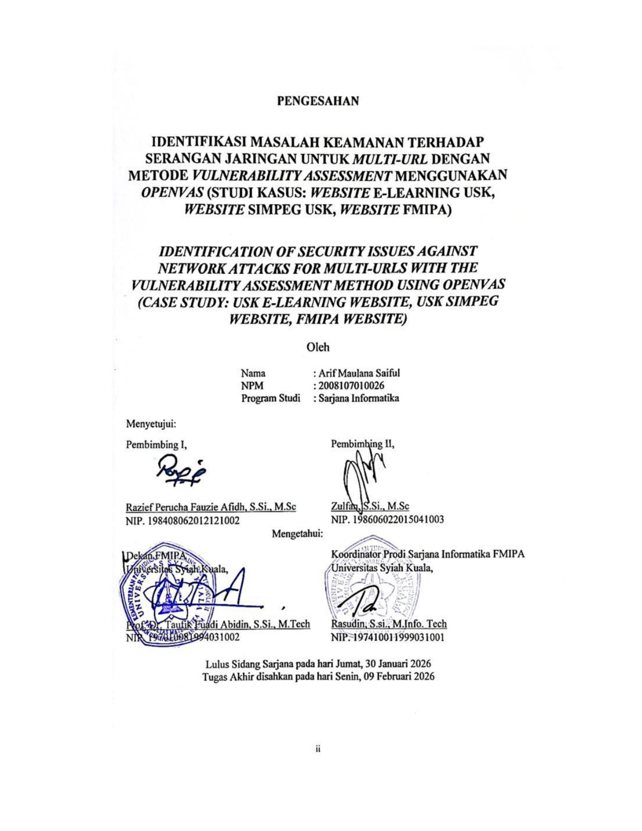 Arif Maulana Saiful, IDENTIFIKASI MASALAH KEAMANAN TERHADAP SERANGAN JARINGAN UNTUK MULTI-URL DENGAN METODE VULNERABILITY ASSESSMENT MENGGUNAKAN OPENVAS (STUDI KASUS: WEBSITE E-LEARNING USK, WEBSITE SIMPEG USK, WEBSITE FMIPA USK). Banda Aceh Fakultas mipa,2026