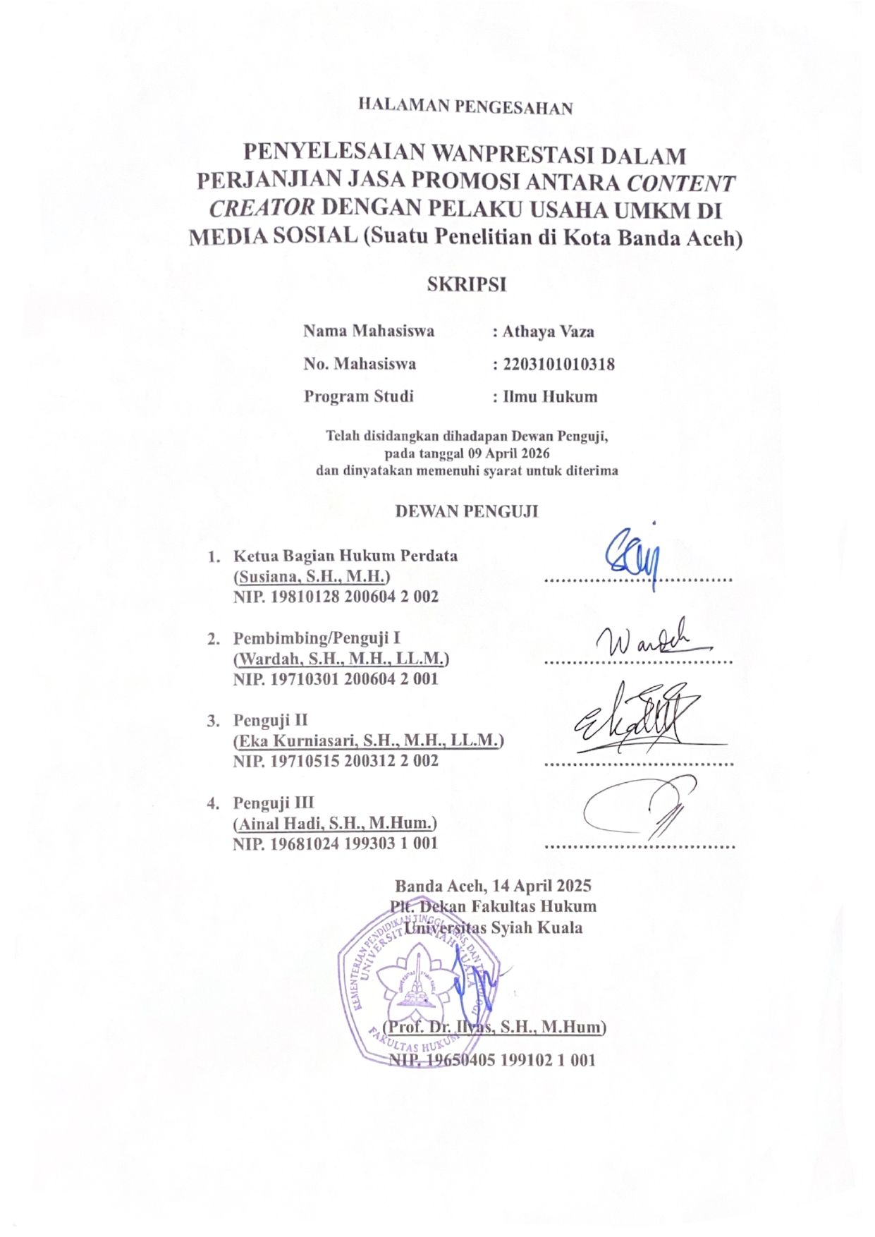 Athaya Vaza, PENYELESAIAN WANPRESTASI DALAM PERJANJIAN JASA PROMOSI ANTARA CONTENT CREATOR DENGAN PELAKU USAHA UMKM DI MEDIA SOSIAL (SUATU PENELITIAN DI KOTA BANDA ACEH). Banda Aceh Fakultas Hukum,2026