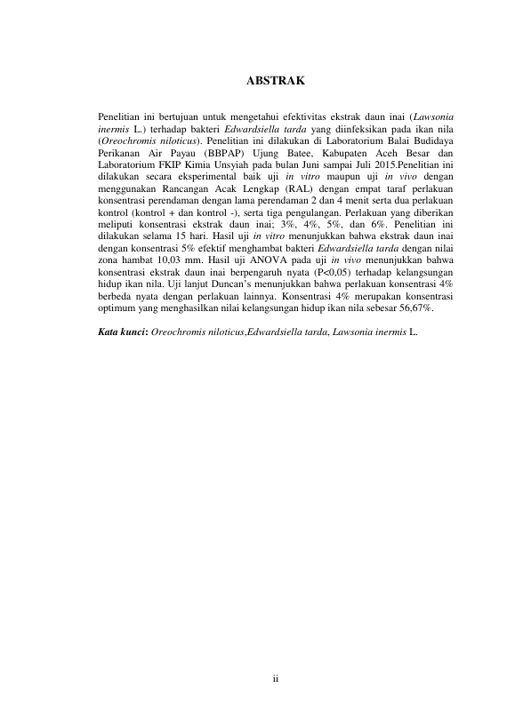 AHMAD ISMAIL FIRDAUSY, EFEKTIFITAS ANTIBAKTERI EKSTRAK DAUN INAI (LAWSONIA INERMIS L.) SEBAGAI ALTERNATIF PENGOBATAN IKAN NILA (OREOCHROMIS NILOTICUS) YANG DIINFEKSI EDWARDSIELLA TARDA. Banda Aceh Universitas Syiah Kuala,2015