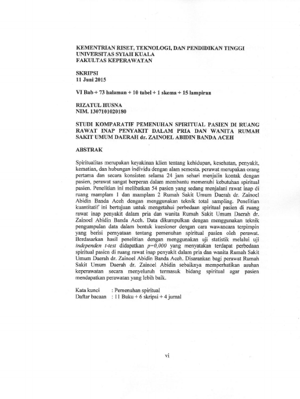 RIZATUL HUSNA, STUDI KOMPARATIF PEMENUHAN SPIRITUAL PASIEN DI RUANG RAWAT INAP PENYAKIT DALAM PRIA DAN WANITA RUMAH SAKIT UMUM DAERAH DR. ZAINOEL ABIDIN BANDA ACEH. Banda Aceh Universitas Syiah Kuala,2015