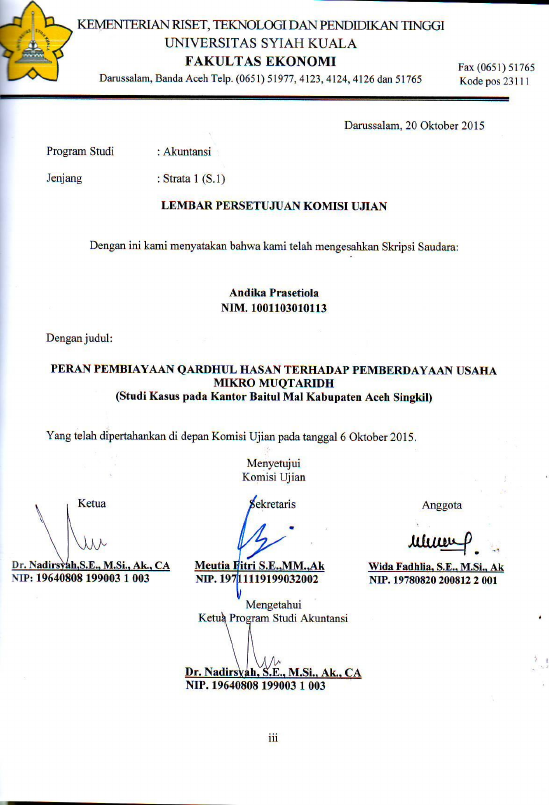 Andika Prasetiola , PERAN PEMBIAYAAN QARDHUL HASAN TERHADAP PEMBERDAYAAN USAHA MIKRO MUQTARIDH (STUDI KASUS PADA BAITUL MAL KABUPATEN ACEH SINGKIL). Banda Aceh Universitas Syiah Kuala,2015