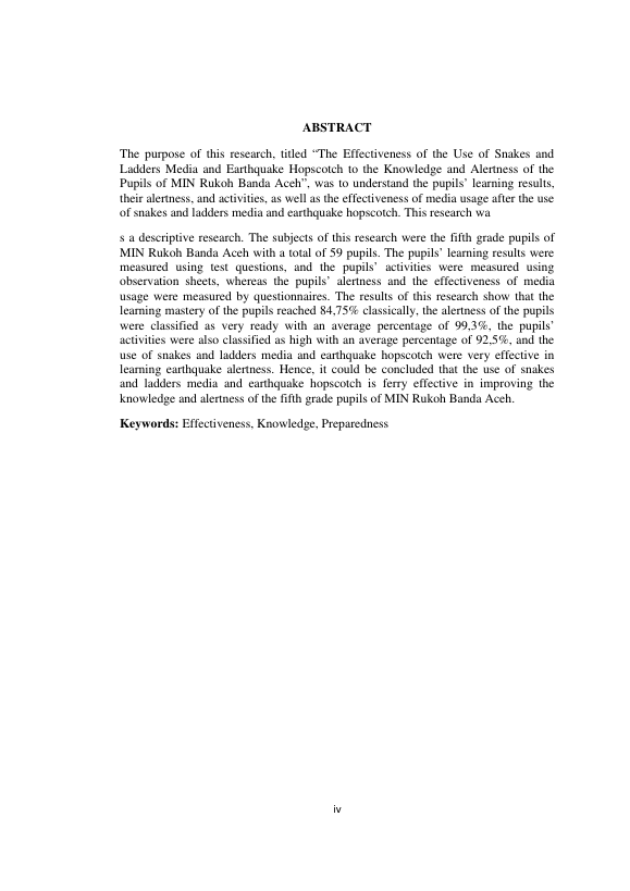 BUDIMAN, EFEKTIVITAS PENGGUNAAN MEDIA ULAR TANGGA DAN ENGKLEK GEMPA BUMI TERHADAP PENGETAHUAN DAN KESIAPSIAGAAN SISWA MIN RUKOH BANDA ACEH. Banda Aceh Prog. Magister Ilmu Kebencanaan Unsyiah,2015
