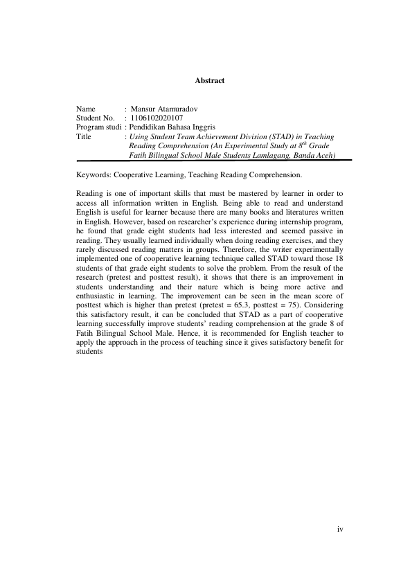 Mansur Atamuradov, USING STUDENT TEAM ACHIEVEMENT DIVISION (STAD) IN TEACHING READING COMPREHENSION (AN EXPERIMENTAL STUDY AT 8TH GRADE FATIH BILINGUAL SCHOOL MALE STUDENTS LAMLAGANG, BANDA ACEH). Banda Aceh Universitas Syiah Kuala,2015