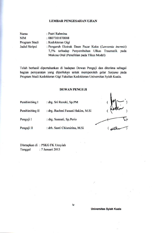 Baca Juga : PENGARUH EKSTRAK DAUN PACAR KU.KU (LAWSONIA INERMIS) 15% TERHADAP PENYEMBUHAN ULKUS TRAUMATIK MUKOSA ORAL SECARA MAKROSKOPIK (PENELITIAN PADA TIKUS MODEL) (Cut Ayu Zuraina, 2023)