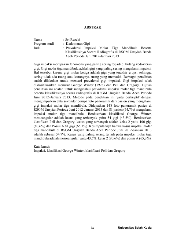 Sri Rezeki, PREVALENSI IMPAKSI MOLAR TIGA MANDIBULA BESERTA KLASIFIKASINYA SECARA RADIOGRAFIS DI RSGM UNSYIAH BANDA ACEH PERIODE JUNI 2012-JANUARI 2013. Banda Aceh Fakultas Kedokteran Gigi,2013