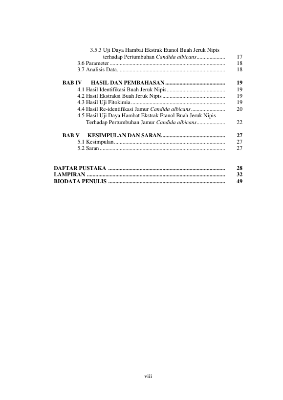 Baca Juga : UJI EFEKTIVITAS EKSTRAK ETANOL BUAH JERUK NIPIS (CITRUS AURANTIFOLIA) DALAM MENGHAMBAT PERTUMBUHAN JAMUR CANDIDA ALBICANS ATCC 10231 (Mikhwanul Jumar, 2015)