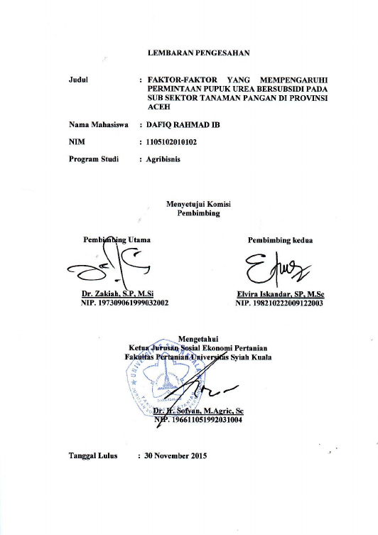 Dafiq Rahmad IB, FAKTOR-FAKTOR YANG MEMPENGARUHI PERMINTAAN PUPUK UREA BERSUBSIDI PADA SUB SEKTOR TANAMAN PANGAN DI PROVINSI ACEH. Banda Aceh Universitas Syiah Kuala,2016