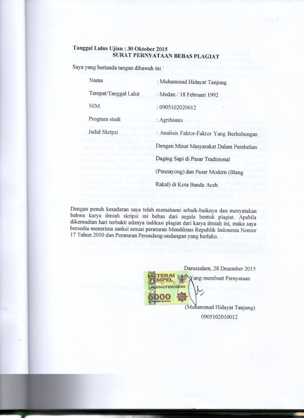MUHAMMAD HIDAYAT TANJUNG, ANALISIS FAKTOR-FAKTOR YANG BERHUBUNGAN DENGAN MINAT MASYARAKAT DALAM PEMBELIAN DAGING SAPI DI PASAR TRADISIONAL (PEUNAYONG) DAN PASAR MODERN (BLANG RAKAL) DI KOTA BANDA ACEH (STUDI KASUS PASAR PEUNAYONG DAN PASAR BLANG RAKAL KOTA BANDA ACEH). Banda Aceh Universitas Syiah Kuala,2016