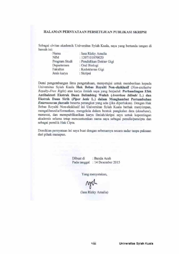 IASA RIZKY AMALIA, PERBANDINGAN EFEK ANTIBAKTERI EKSTRAK DAUN BELIMBING WULUH (AVERRHOA BILIMBI L.) DAN EKSTRAK DAUN SIRIH (PIPER BETLE L.) DALAM MENGHAMBAT PERTUMBUHAN ENTEROCOCCUS FAECALIS. Banda Aceh Universitas Syiah Kuala,2016
