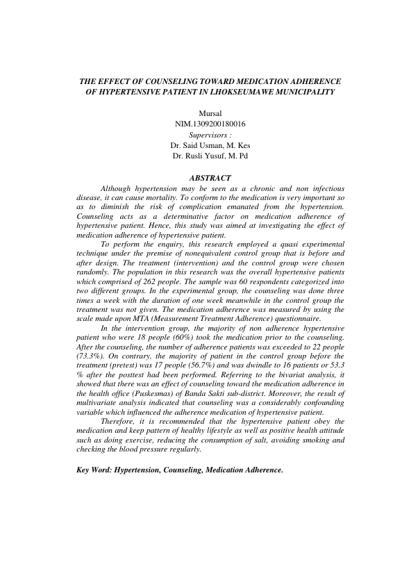 MURSAL, PENGARUH KONSELING TERHADAP KEPATUHAN BEROBAT PENDERITA HIPERTENSI DI KOTA LHOKSEUMAWE. Banda Aceh Prog. Studi Megister Keperawatan,2015
