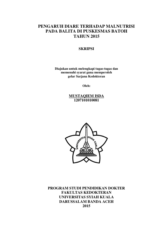 Mustaqiem Isda, PENGARUH DIARE TERHADAP MALNUTRISI PADA BALITA DI PUSKESMAS BATOH TAHUN 2015. Banda Aceh Universitas Syiah Kuala,2016
