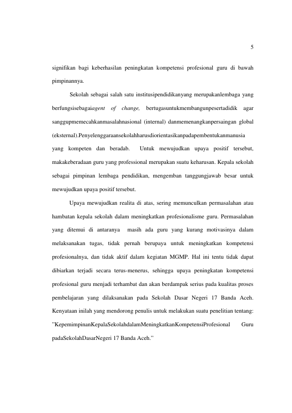 Baca Juga : KEPEMIMPINAN KEPALA SEKOLAH DALAM MENINGKATKAN KOMPETENSI PROFESIONAL GURU PADA SEKOLAH DASAR NEGERI 17 BANDA ACEH (CUT AJA IRAWATI, 2016)