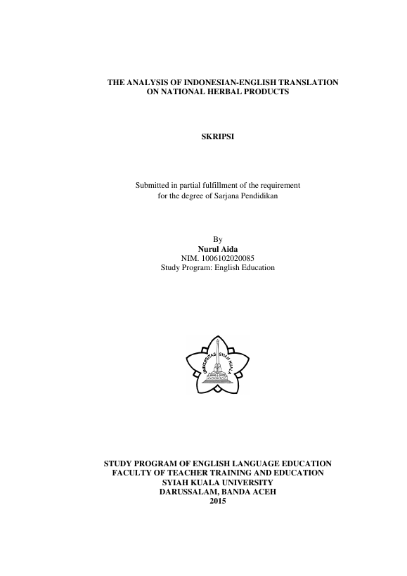 Nurul Aida, THE ANALYSIS OF INDONESIAN-ENGLISH TRANSLATION ON NATIONAL HERBAL PRODUCTS. Banda Aceh Universitas Syiah Kuala,2016