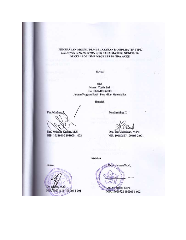 Yustia Sari, PENERAPAN MODEL PEMBELAJARAN KOOPERATIF TIPE GROUP INVESTIGATION (GI) PADA MATERI SEGITIGA DI KELAS VII SMP NEGERI 8 BANDA ACEH. Banda Aceh Fakultas Keguruan dan Ilmu Pendidikan,2013